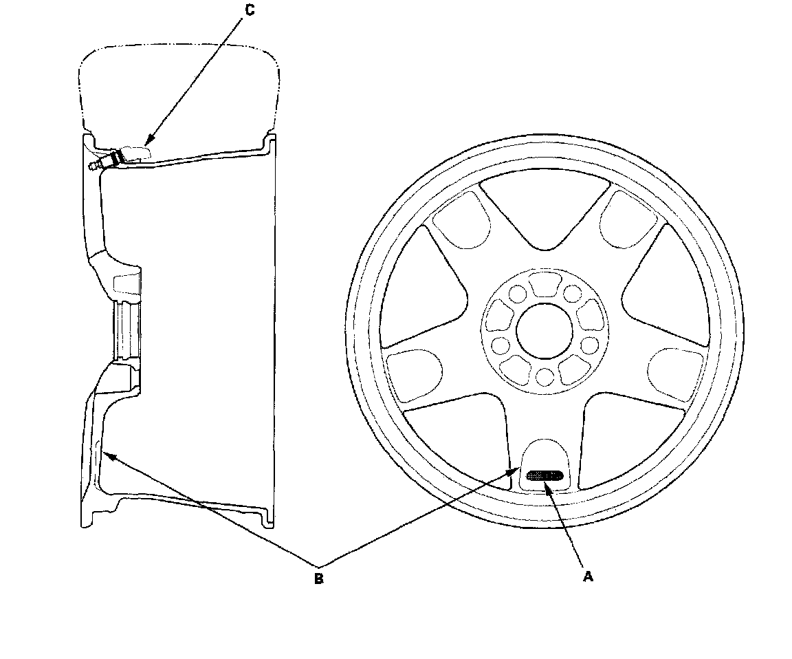 TPMS will not work unless TPMS type wheels are installed on the vehicle. The original equipment wheels have a TPMS mark on them (A), and a counterweights (B) cast into the opposite side of the spoke to balance the weight of the tire pressure sensor (C).