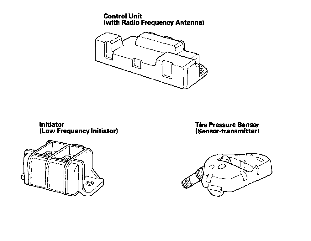 Each sensor is an integrated unit made up of the tire valve stem, a pressure sensor, and a transmitter. The unit is attached to the inside of the wheel, around the valve stem. The sensor transmits the tire pressure to the control unit when tire pressure is less than 1,68 kPa (1.7 kgf/cm2, 24 psi). The control unit then turns on the low pressure indicator and the appropriate tire(s) indicator. When that tire's pressure is increased to more than 198, kPa (2.0 kgf/cm2, 29 psi), the transmitter sends tire pressure to the control unit, and then the control unit turns the indicators off.