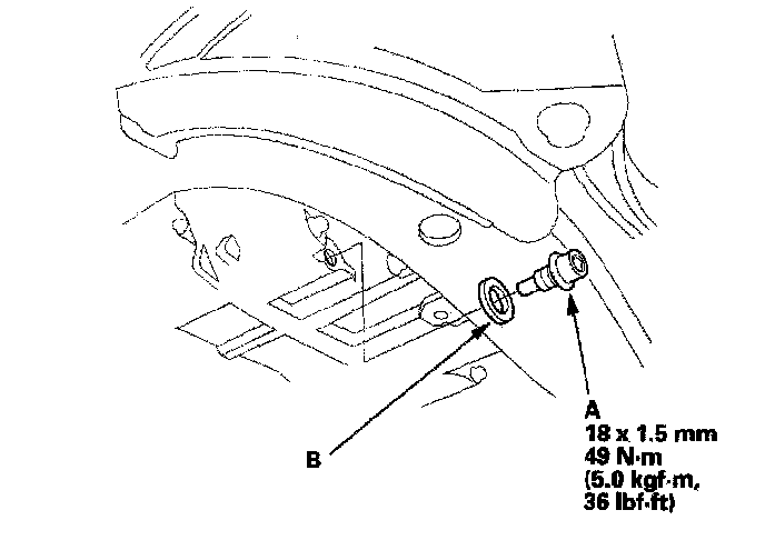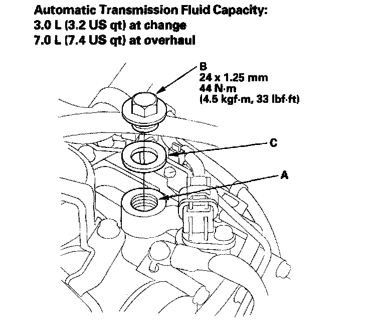 6. Install the ATF filler bolt (B) with a new sealing washer (C).