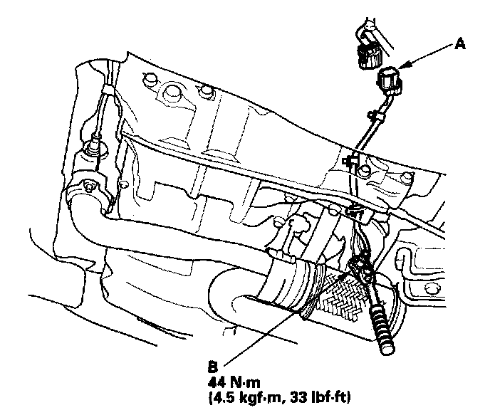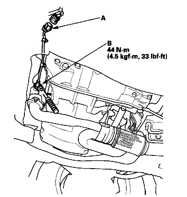 1. Disconnect the front secondary HO2S 4P connector (A), then remove the front secondary HO2S (B).