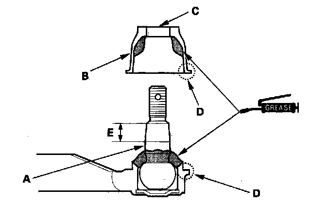 ^ Keep grease off the boot mounting area (D) and the tapered section (E) of the ball pin.
