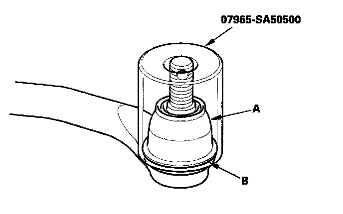 4. Install the new boot (A) using the special tool. The boot must not have a gap at the boot installation sections (B). After installing the boot, check the ball pin tapered section for grease contamination, and wipe it if necessary.