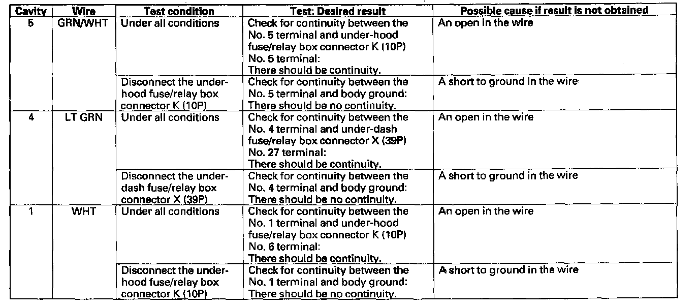 7. Disconnect the connector from the wiper/washer switch, and make these input tests at the connector.