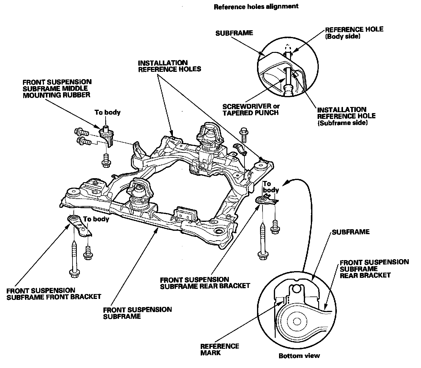 - When installing, align both installation reference holes in the subframe with the reference holes in the body using a screwdriver or tapered punch as a guide.
