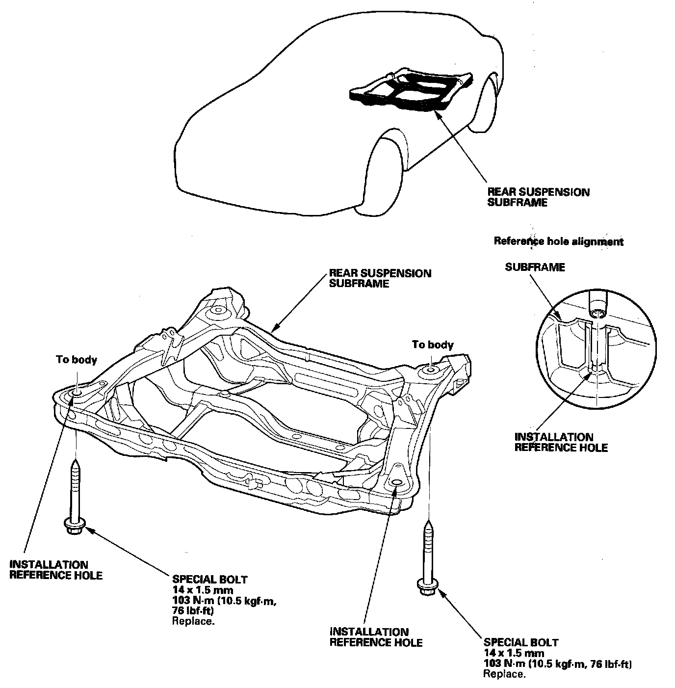 After removing the subframe mounting special bolts, be sure to replace them with new ones.