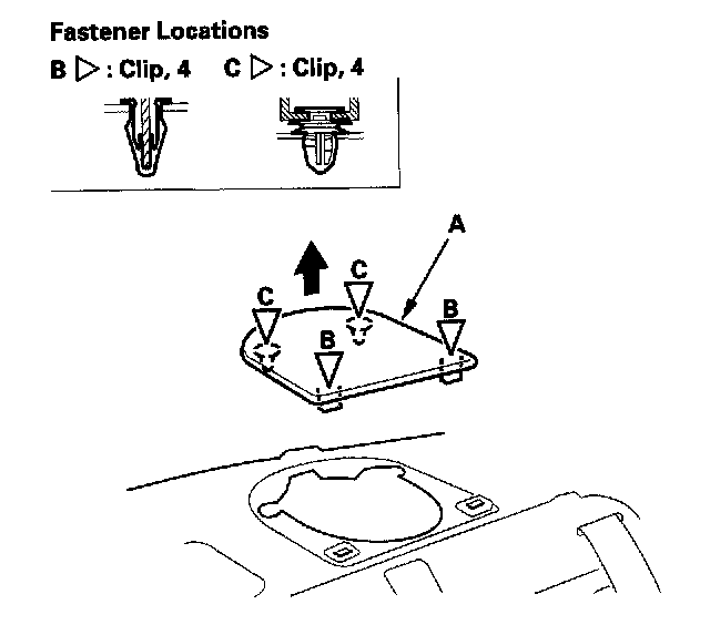 3. From both sides, pull the rear speaker grille (A) up to detach the clips (B, C), then remove the rear speaker grille.