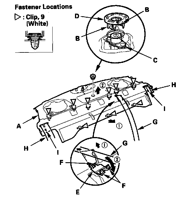 5. Pull the rear center seat belt (G) out through the lid opening, and pull the rear seat belts (H) out through the slit (I) in the rear shelf.