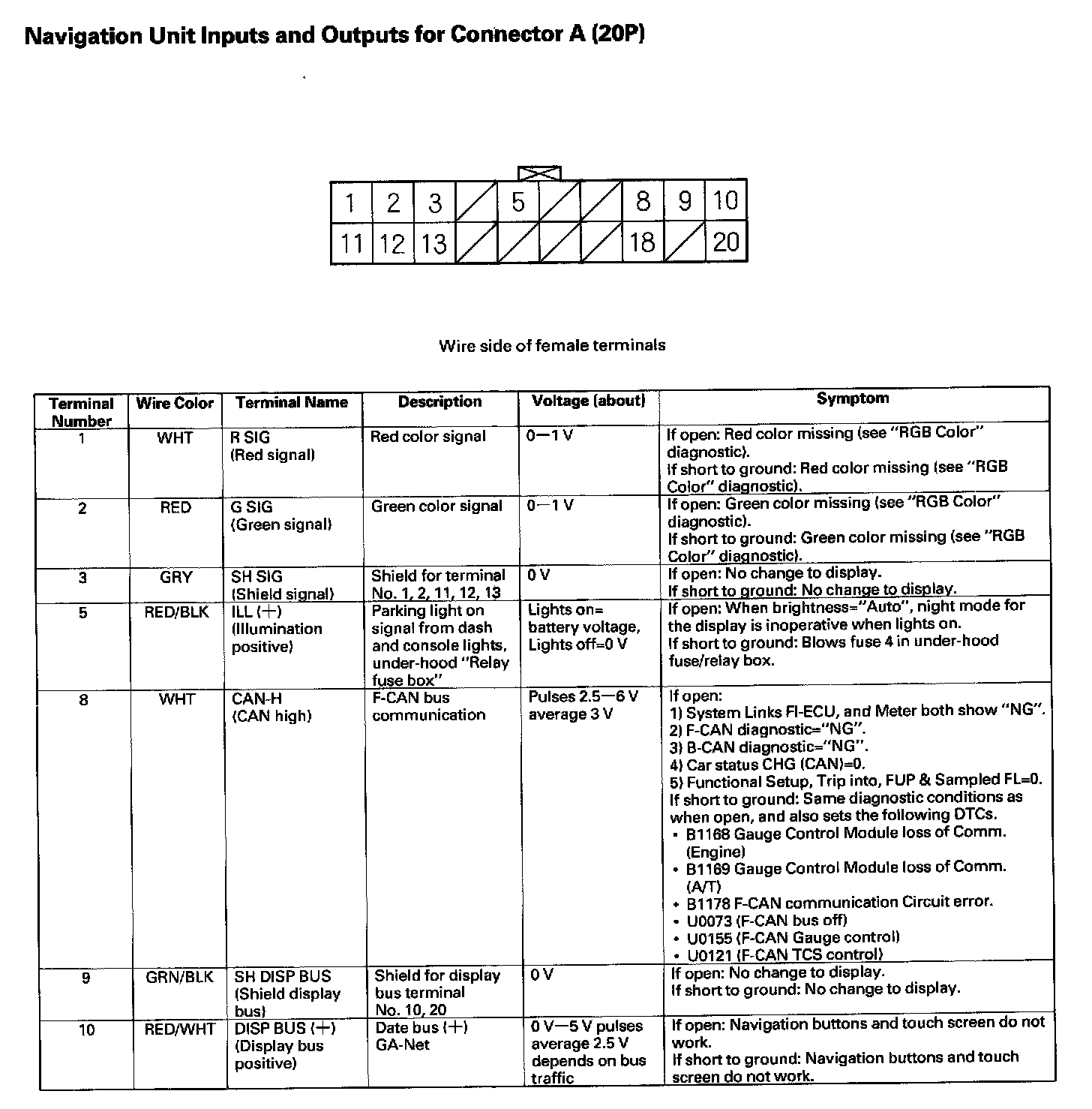 Navigation Unit Inputs And Outputs For Connector A(20P):
