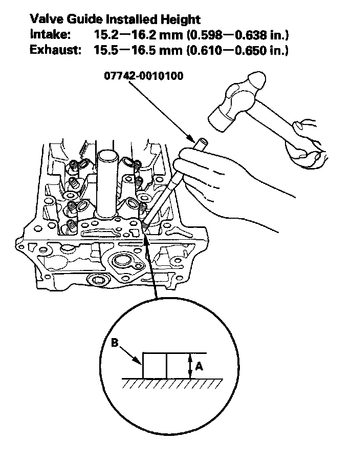 9. Apply a thin coat of clean engine oil to the outside of the new valve guide. Install the guide from the camshaft side of the head; use the special tool to drive the guide in to the specified installed height (A) of the guide (B). If you have all 16 guides to do, you may have to reheat the head.