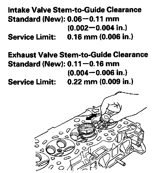 3. Subtract the O.D. of the valve stem, measured with a micrometer, from the I.D. of the valve guide, measured with an inside micrometer or ball gauge. Take the measurements in three places along the valve stem and three places inside the valve guide. The difference between the largest guide measurement and the smallest stem measurement should not exceed the service limit.