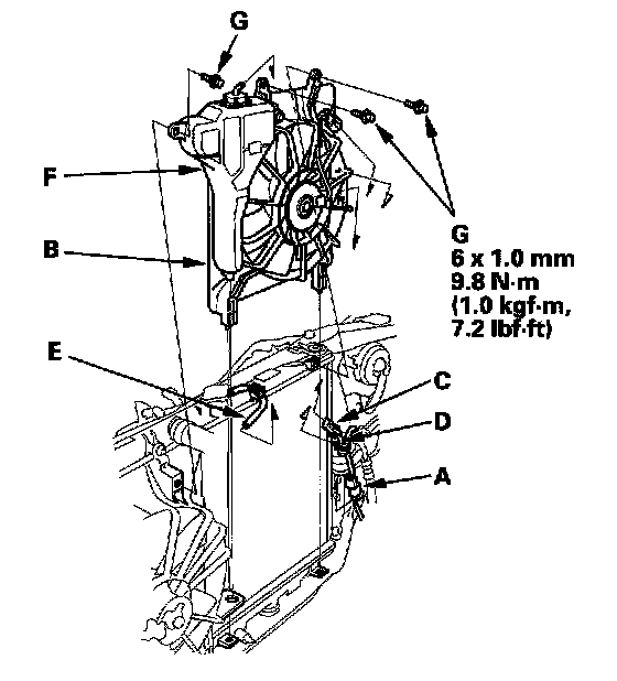 6. Remove the A/C compressor clutch connector (A) from the A/C condenser fan shroud (B). Disconnect the A/C condenser fan connector (C), then remove the wire harness clip (D) from the A/C condenser fan shroud. Remove the hose (E) from the reserve tank (F). Remove the bolts (G) and the radiator fan shroud. Be careful not to damage the radiator fins when removing the A/C condenser fan shroud.