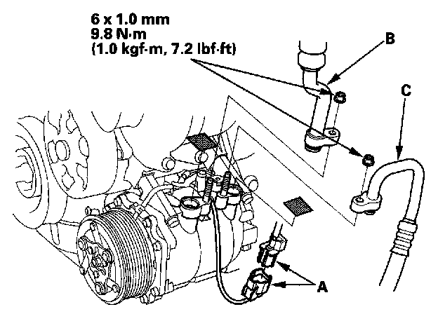 7. Disconnect the A/C compressor clutch connector (A). Remove the nuts, then disconnect the suction line (B) and discharge line (C) from the A/C compressor. Plug or cap the lines immediately after disconnecting them to avoid moisture and dust contamination.