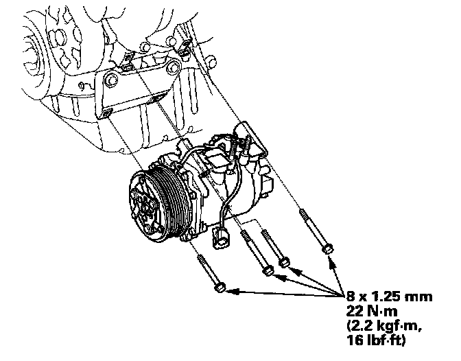 10. Install the A/C compressor in the reverse order of removal, and note these items: