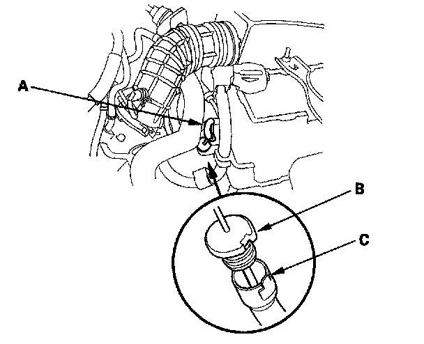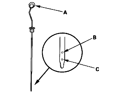 5. Remove the dipstick (A) and check the fluid level. It should be between upper mark (B) and lower mark (C).