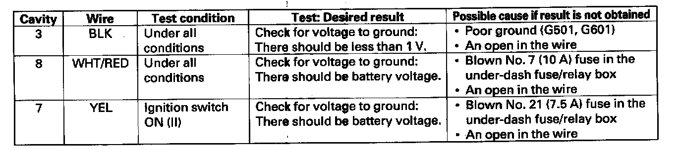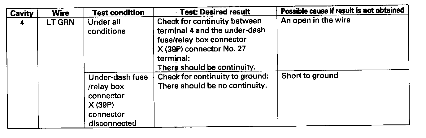 4. Reconnect the connector to the wiper/washer switch, and make these input tests at the connector.