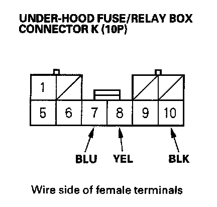 5. Disconnect the 10P connector from the under-dash fuse/relay box, and make these input tests at the connector.