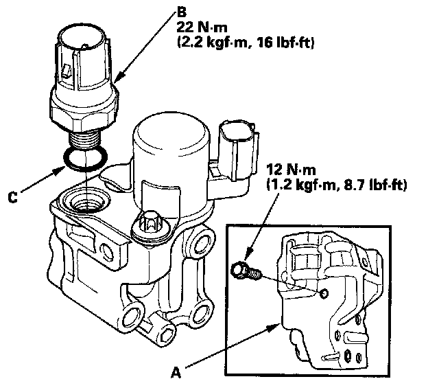 5. Install the valve in the reverse order of removal with a new rocker arm oil control valve (VTEC solenoid valve) filter and a new O-ring (C).