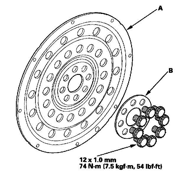 Install the drive plate and washer on the engine crankshaft, and tighten the eight bolts in a crisscross pattern in two or more steps.