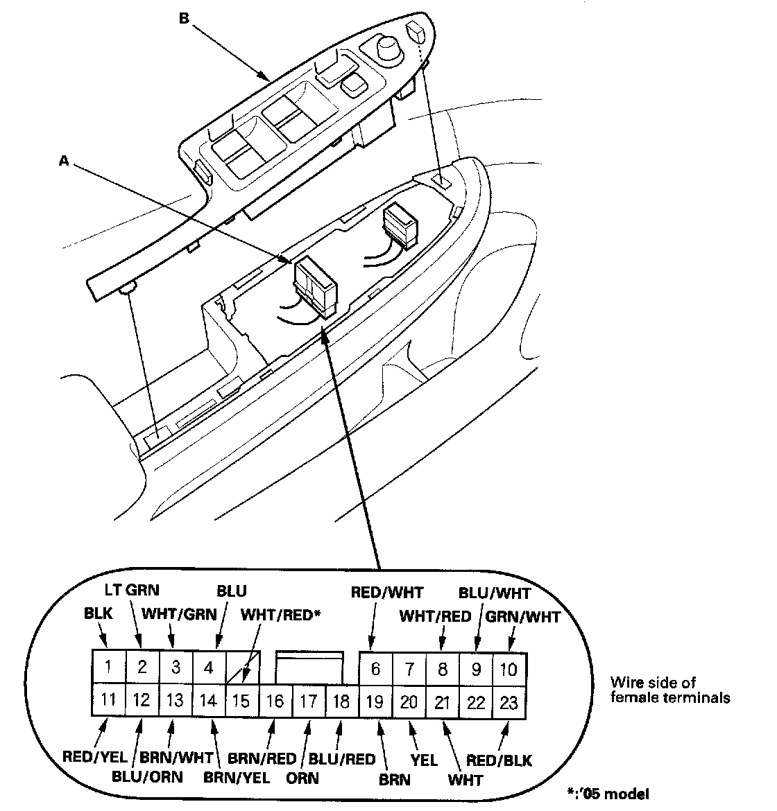 3. Disconnect the power window master switch 23P connector (A) from the power window master switch (B).