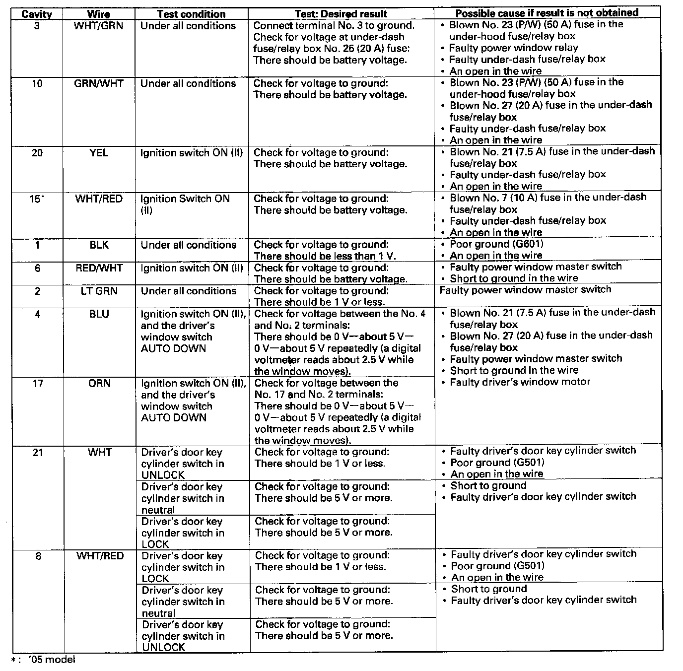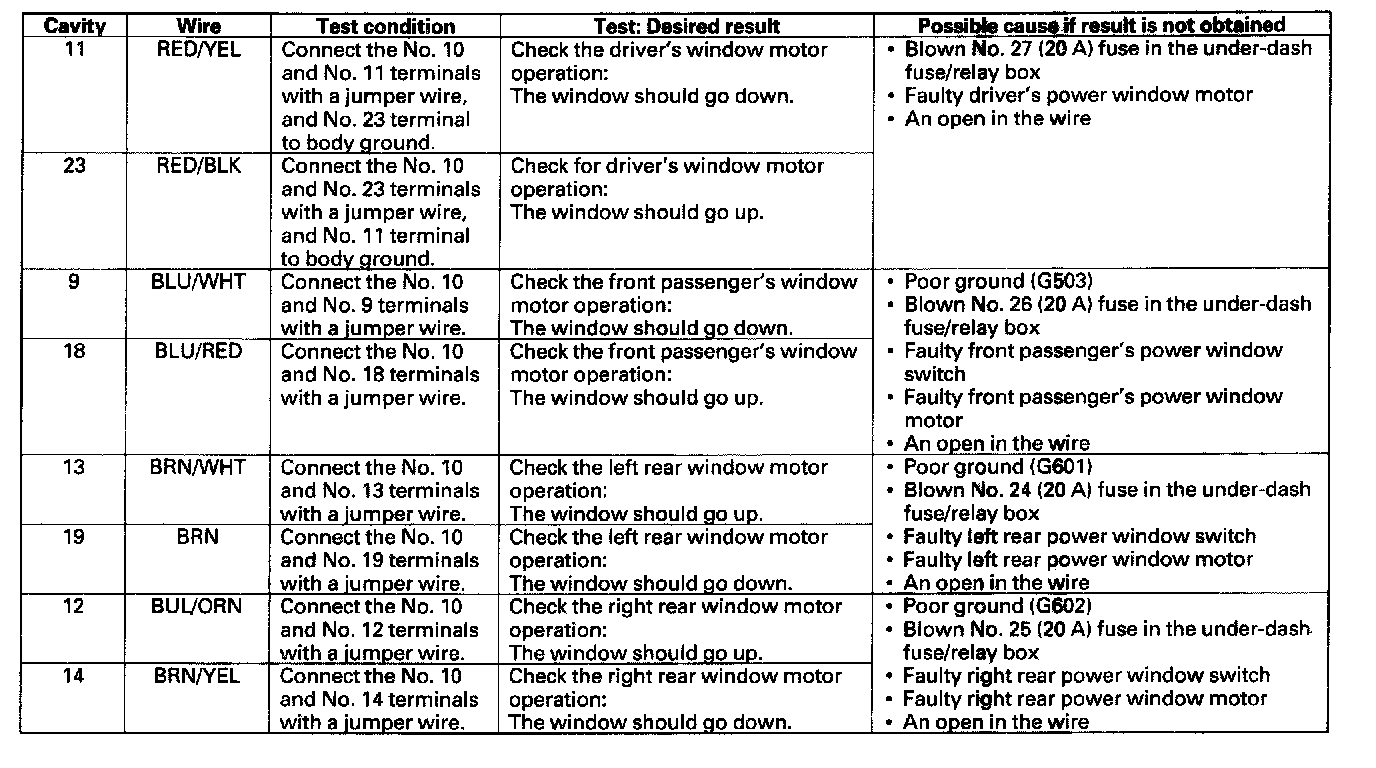 6. Disconnect the 23P connector from the power window master switch, and make these input tests at the connector.