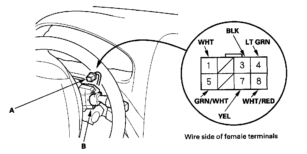 4. Disconnect the 8P connector (A) from the wiper/washer switch (B).