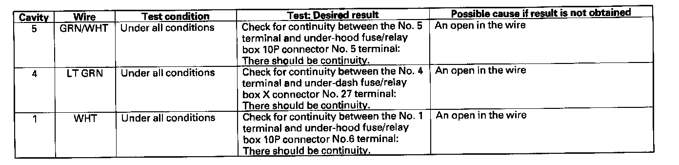 6. Reconnect the connector to the wiper/washer switch, and make these input tests at the connector.
