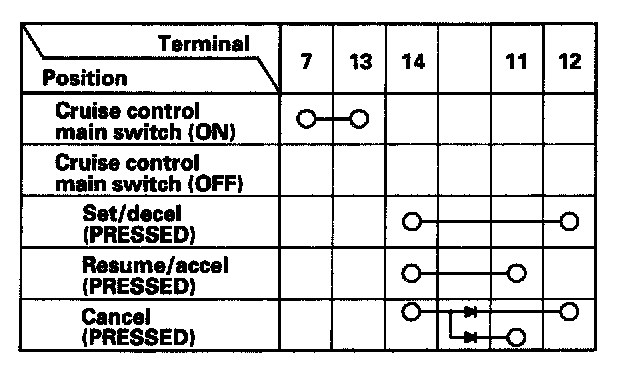 - If there is continuity, and it matches the table, but switch failure occurred on the cruise control input test, check and repair the wire harness on the switch circuit.