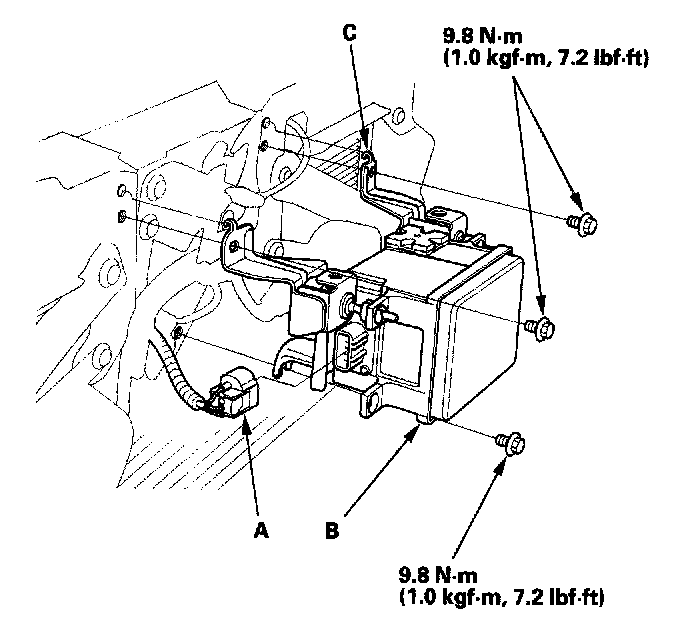 4. Loosen the aiming, bolts (A) a little at a time, and remove the millimeter wave radar unit (B) from the main bracket (C).