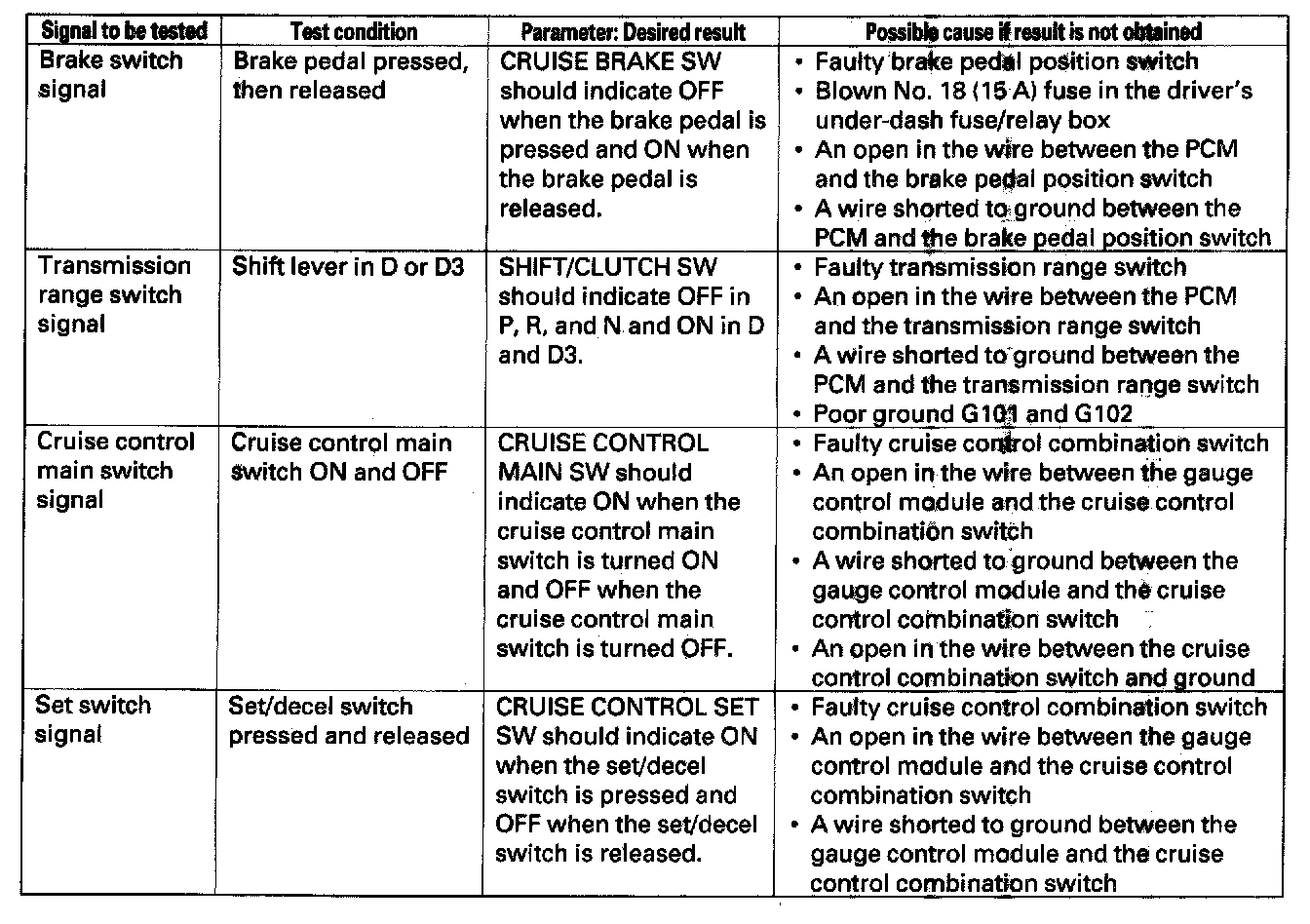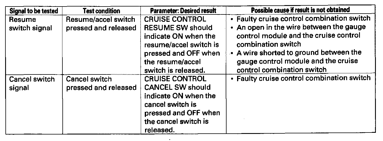NOTE: Intermittent failures are often caused by loose circuit connections. While monitoring cruise control inputs, flex their circuits, and note if any of the test results change.