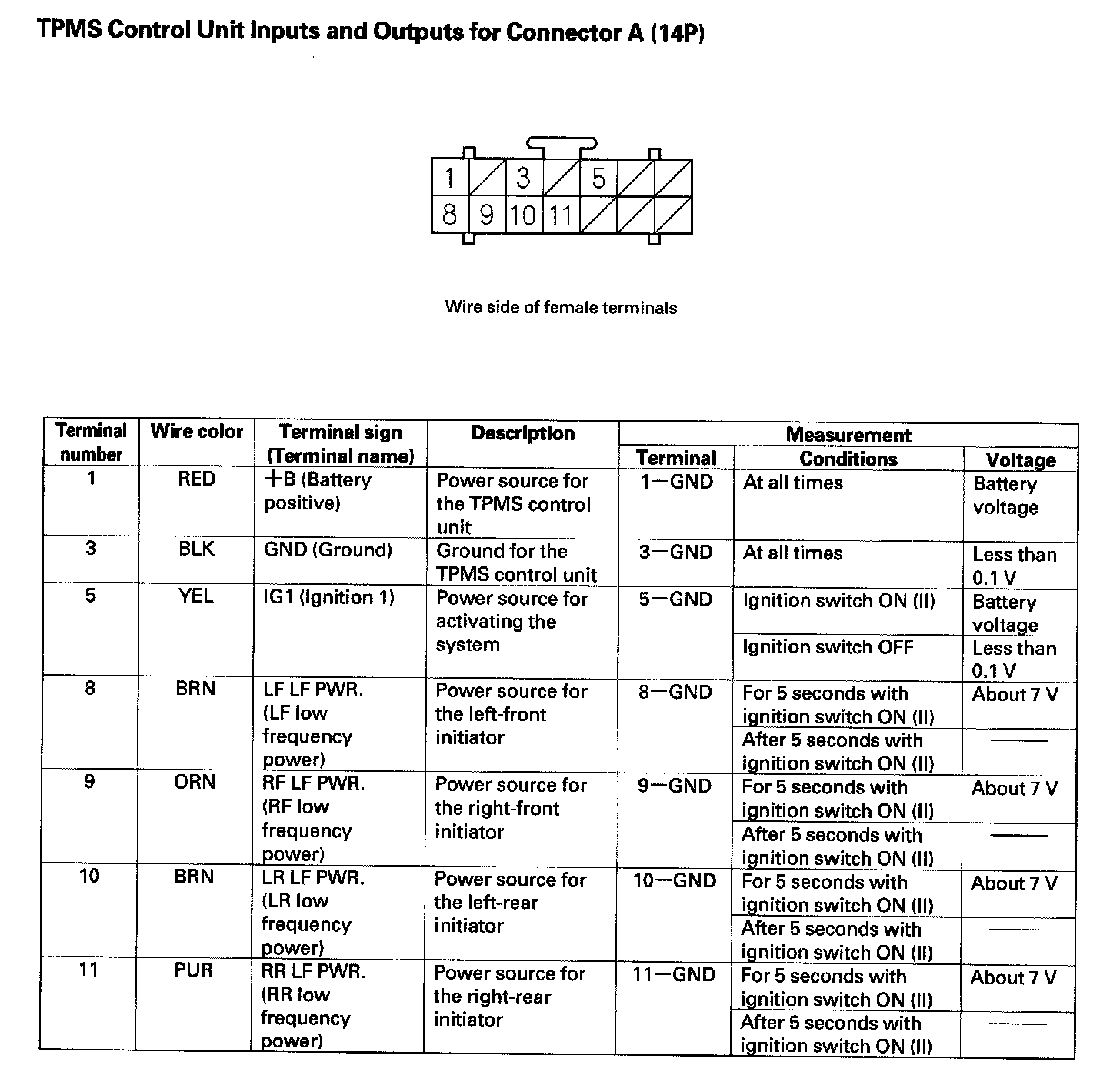 TPMS Control Unit Inputs And Outputs For Connector A (14P):