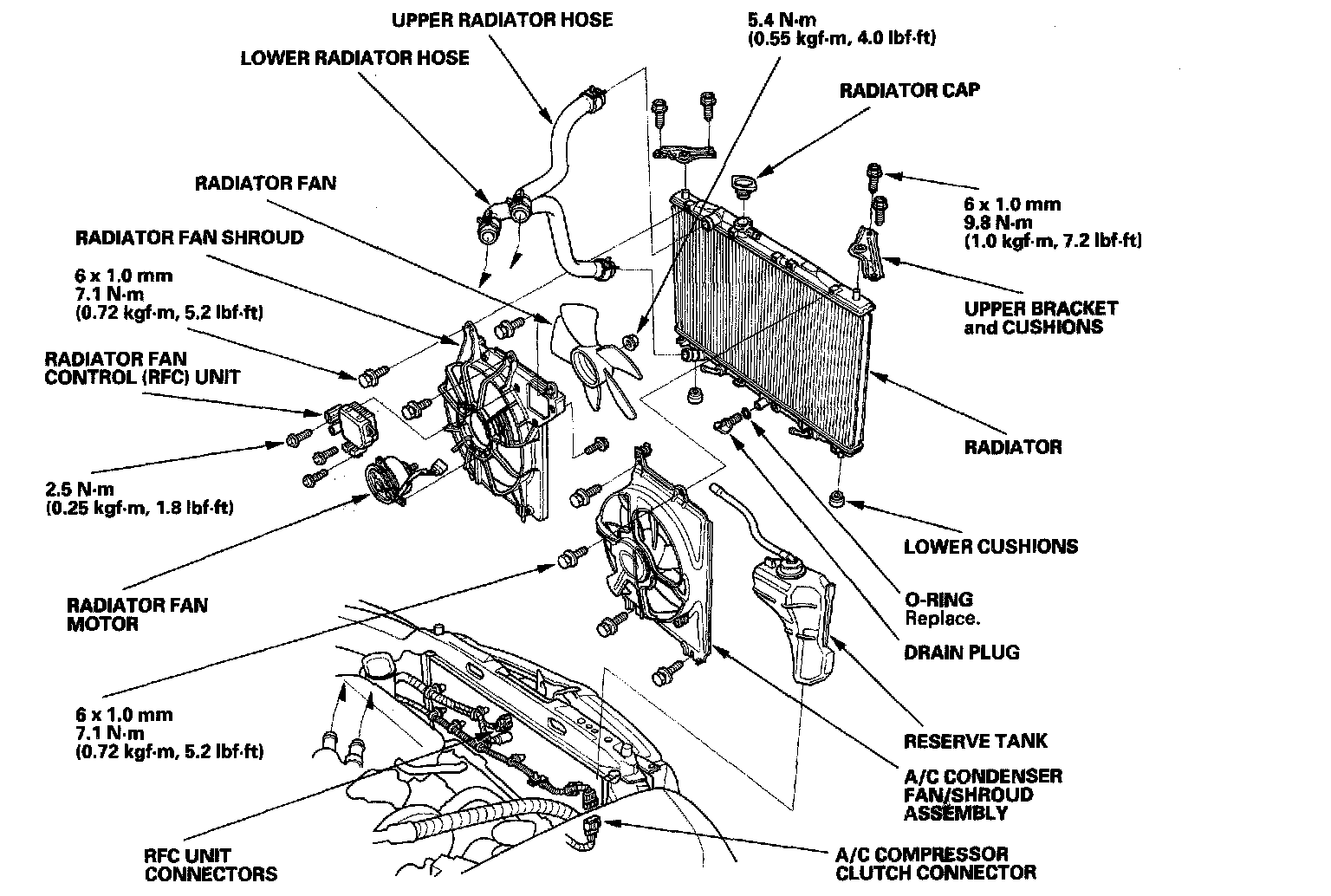 5. Disconnect the radiator fan control (RFC) unit connectors. Remove the harness clamps and A/C compressor clutch connector.