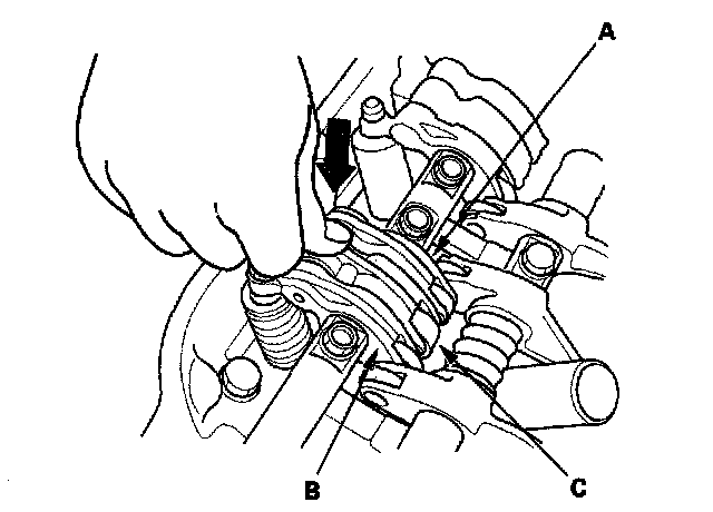 4. Push on the intake mid rocker arm (A) for the No. 1 cylinder. The mid rocker arm should move independently of the primary rocker arm (B) and secondary rocker arm (C).