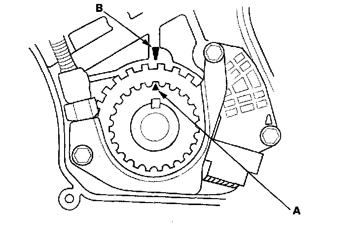 5. Set the timing belt drive pulley to top dead center (TDC) by aligning the TDC mark (A) on the tooth of the timing belt drive pulley with the pointer (B) on the oil pump.
