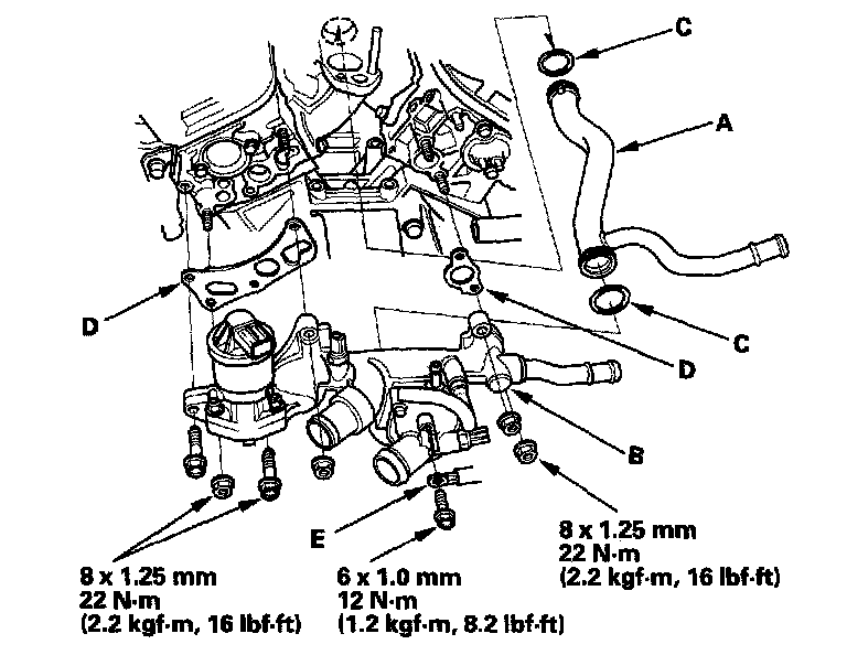 16. Install the connecting pipe (A) and water passage (B), using the O-rings (C) and new gaskets (D).
