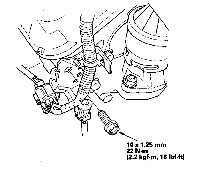 23. Install the two bolts (B) securing the vacuum line.