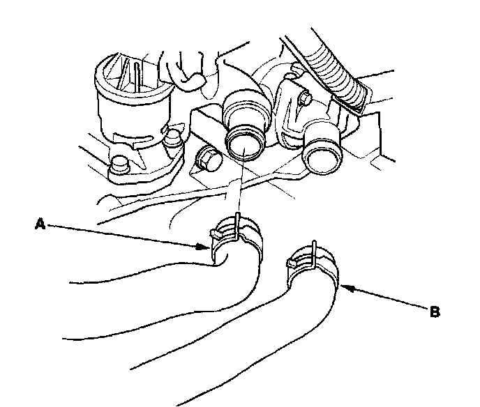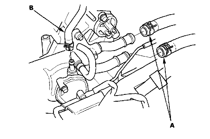 25. Install the heater hoses (A) and water bypass hose (B).
