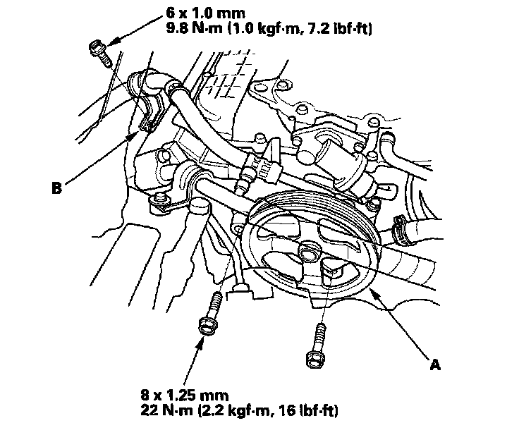 29. Install the power steering (P/S) pump (A) and P/S hose bracket (B).