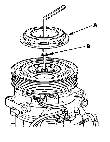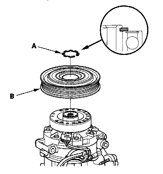 3. If you are replacing the field coil, remove the snap ring (A) with snap ring pliers, then remove the pulley (B). Be careful not to damage the pulley or the A/C compressor.
