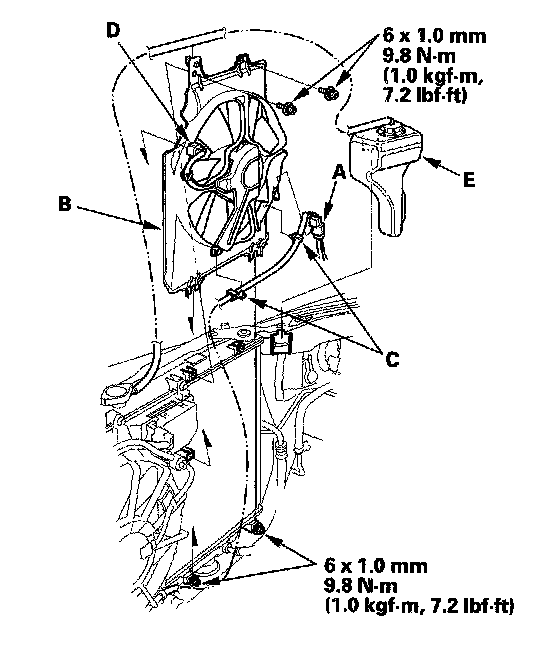 6. Remove the A/C compressor clutch connector (A) from the NC condenser fan shroud (B). Remove the clips (C). Disconnect the connector (D) from the radiator fan control unit. Loosen the lower mounting bolts, then remove the upper mounting bolts. Detach the reserve tank (E) from the frame. Remove the NC condenser fan shroud. Be careful not to damage the radiator fins when removing the A/C condenser shroud.