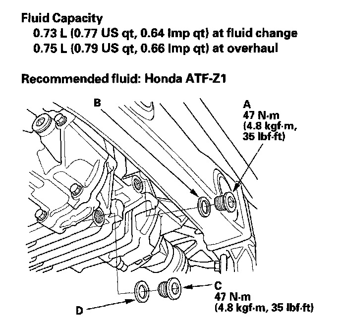 3. Remove the drain plug (C) and the sealing washer (D), and drain the fluid.