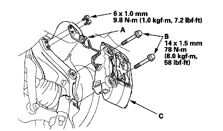 4. Remove the brake caliper bracket mounting bolts (B), and remove the caliper assembly (C) from the knuckle. To prevent damage to the caliper assembly or brake hose, use a short piece of wire to hang the caliper assembly from the undercarriage. Do not twist the brake hose with force.