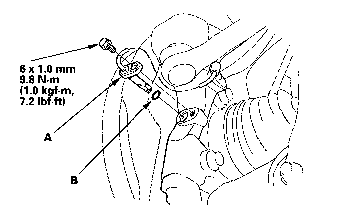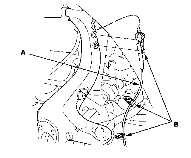5. Remove the wheel sensor (A) and O-ring (B) from the knuckle. Do not disconnect the wheel sensor connector.