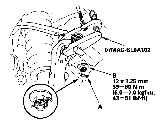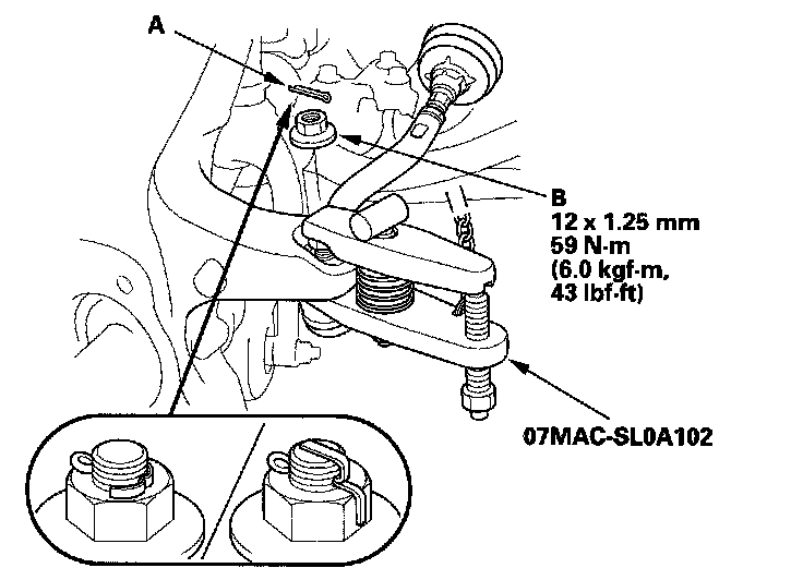 7. Remove the lock pin (A) from the upper arm ball joint, and loosen the nut (B).