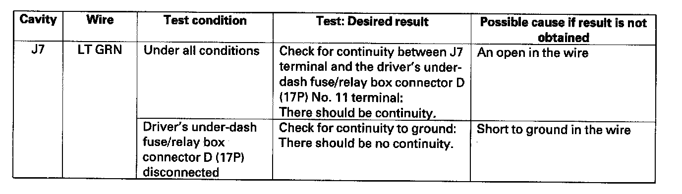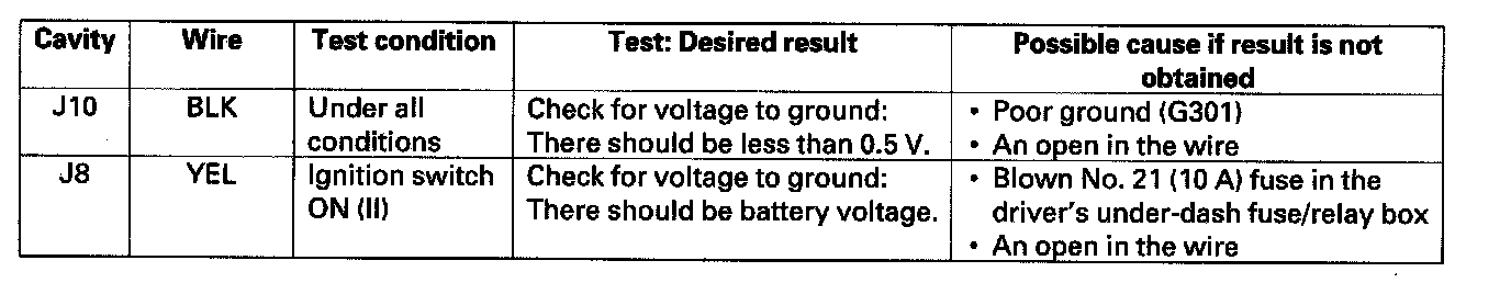 5. Disconnect the under-hood fuse/relay box connector J (10P), and make these input tests at the connector.
