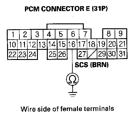 16. Check for continuity between PCM connector terminal E16 and body ground.