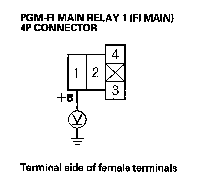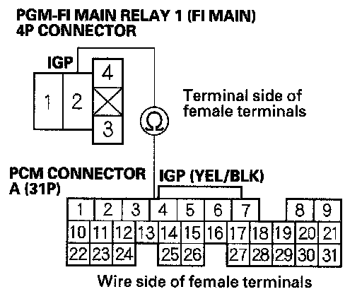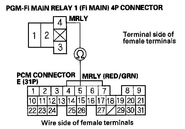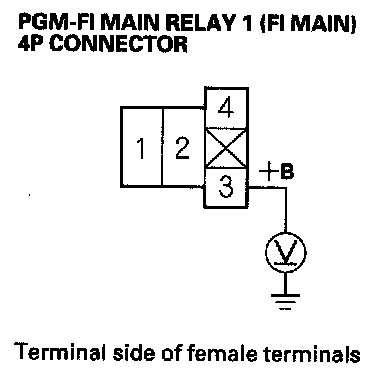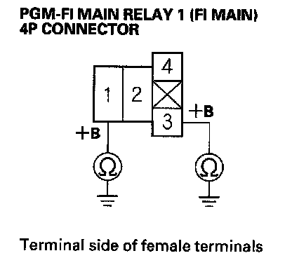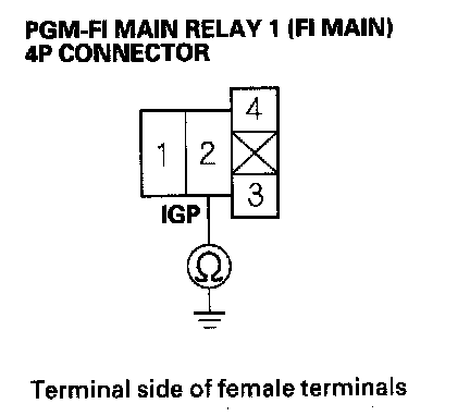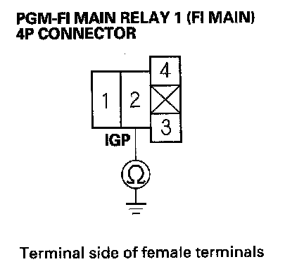 27. Check for continuity between body ground and PGM-FI main relay 1 (FI MAIN) 4P connector terminals No. 1 and No. 3 individually.