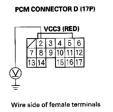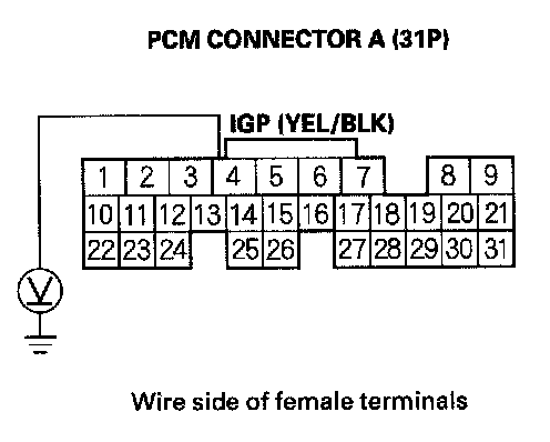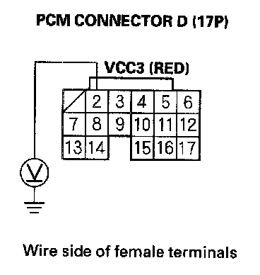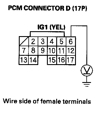 32. Measure voltage between PCM connector terminal D6 and body ground.