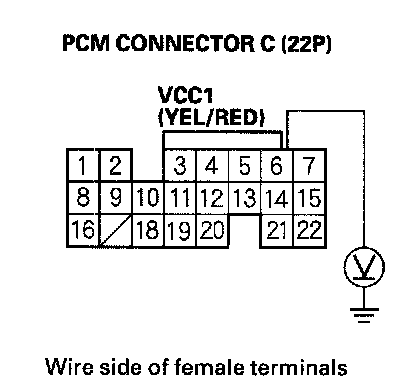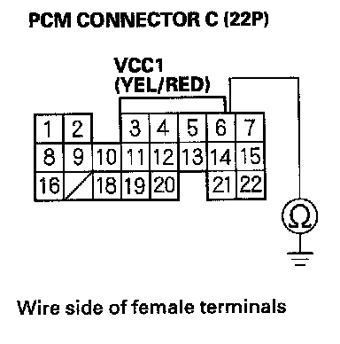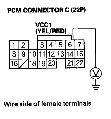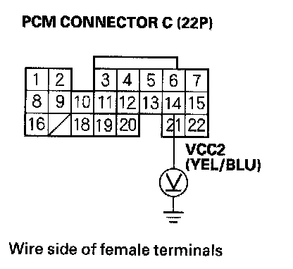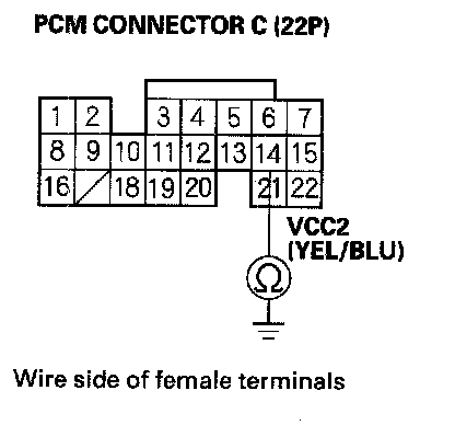 61. Disconnect the connector from each of the following sensors, one at a time, while measuring voltage between body ground and PCM connector terminal C14 with the ignition switch ON (II).