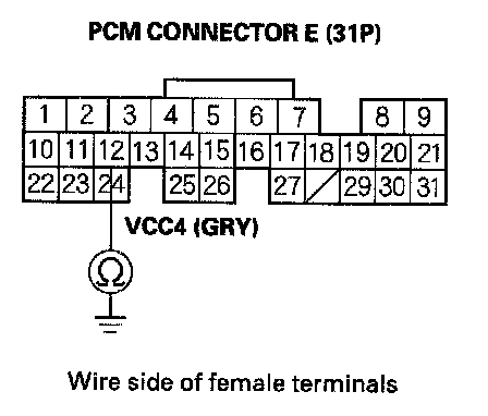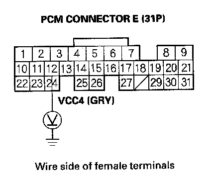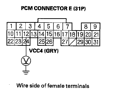 77. Disconnect the connector, from each of the following sensors, one at a time, and measure voltage between body ground and PCM connector terminal E12 with the ignition switch ON (II).