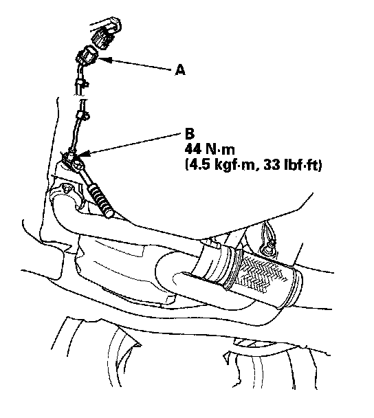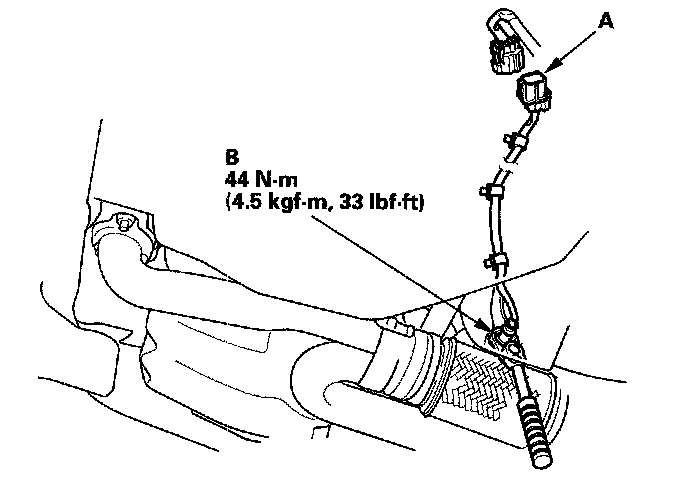 1. Disconnect the front secondary HO2S 4P connector (A), then remove the front secondary HO2S (B) with an O2 sensor socket wrench.
